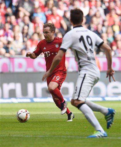 Bayern's Mario Goetze, left, and Frankfurt's David Abraham challenge for the ball during the German Bundesliga soccer match between Bayern Munich and Eintracht Frankfurt in Munich, Germany, Saturday April 2, 2016. (Tobias Hase/dpa via AP) The Associated Press