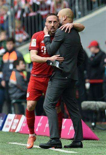 Franck Ribery of Munich celebrates his open goal with with coach Pep Guardiola, right, during the German Bundesliga soccer match between Bayern Munich and Eintracht Frankfurt in the Allianz Arena in Munich, Germany,Saturday, April 2, 2016. (Tobias Hase/dpa via AP) The Associated Press
