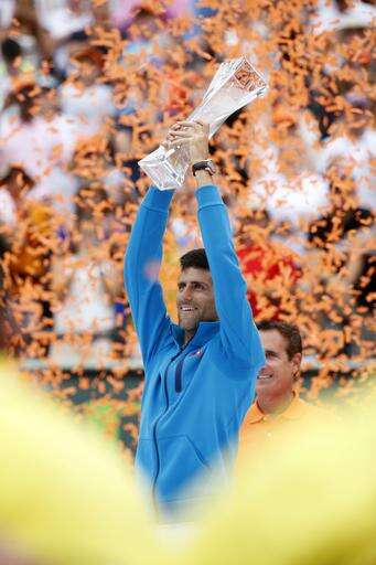 Novak Djokovic, of Serbia, holds his trophy after defeating Kei Nishikori, of Japan, 6-3, 6-3, during the men's singles final match at the Miami Open tennis tournament, Sunday, April 3, 2016, in Key Biscayne, Fla. (AP Photo/Wilfredo Lee) The Associated Press