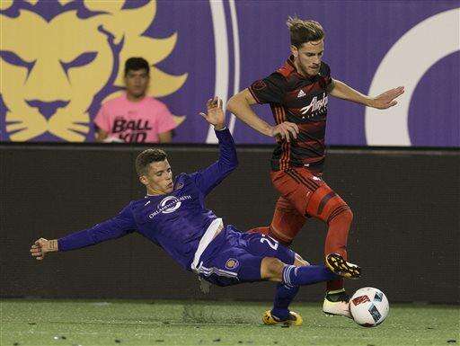 Orlando City FC forward Adrian Winter, right, and Portland Timbers defender Alvas Powell fight for possession of the ball in the first half of an MLS soccer game, Sunday, April 3, 2016, in Orlando, Fla. (AP Photo/Scott Audette) The Associated Press