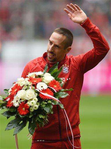 In this April 2, 2016 picture Munich's Franck Ribery holds a bouquet for his 200th Bundesliga game ahead of the German Bundesliga soccer match between Bayern Munich and Eintracht Frankfurt in Munich, Germany. (Tobias Hase/dpa via AP) The Associated Press