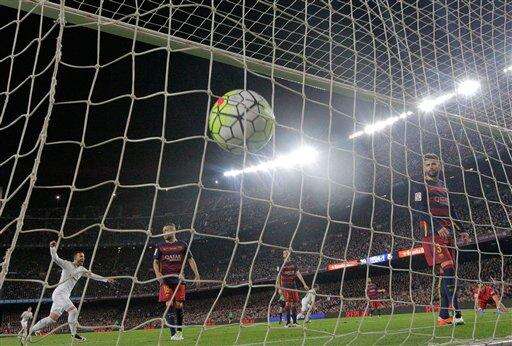 Barcelona goalkeeper Claudio Bravo, right, and Gerard Pique, 2nd right, watch the ball hit the net after Real Madrid's Cristiano Ronaldo scored the winning goal during a Spanish La Liga soccer match between Barcelona and Real Madrid, dubbed 'el clasico', at the Camp Nou stadium in Barcelona, Spain, Saturday, April 2, 2016. Real Madrid won 2-1. (AP Photo/Manu Fernandez) The Associated Press