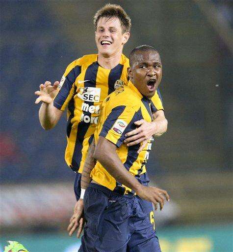 Hellas Verona's Brazilian defender Samir, bottom, celebrates with his teammate Michelangelo Albertazzi after scoring during a Serie A soccer match between Bologna and Hellas Verona, in Bologna's Dall'Ara Stadium, Italy, Monday, April 4, 2016. (Giorgio Benvenuti/ANSA via AP)