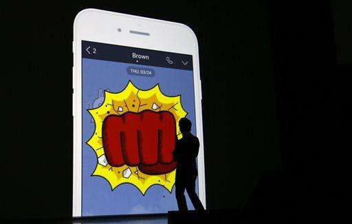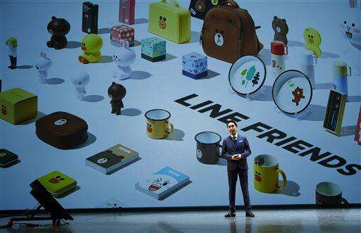 In this Thursday, March 24, 2016 photo, Line Corp. President and CEO Takeshi Idezawa speaks in front of a "stamp" displayed on screen, during a press conference of Line Conference Tokyo 2016 in Urayasu, near Tokyo. Line and Kakao Talk are two Asian mobile messengers that outgrew Facebook and Twitter in Japan and in South Korea in terms of user number. But as growth pace of users and revenues slowed, they have come under pressure to monetize new services. (AP Photo/Shizuo Kambayashi) The Associated Press