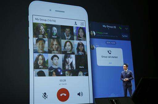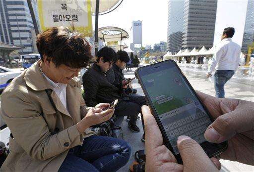 In the April 5, 2016, photo, a man, right, uses his smartphone to send messages via Kakao Talks, a South Korean mobile messaging app, in Seoul, South Korea. Kakao Talk and Line are two Asian mobile messengers that outgrew Facebook and Twitter in Japan and in South Korea in terms of user number. But as growth pace of users and revenues slowed, they have come under pressure to monetize new services. Kakao Talks has 48 million active users in about 230 nations, including 40 million in South Korea. (AP Photo/Ahn Young-joon) The Associated Press