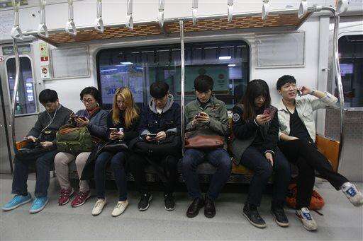 In the April 5, 2016, photo, passengers use their smartphones on a subway train in Seoul, South Korea. The big social-media players in Asia are growing by making mobile messaging applications an integral part of the personal and professional lives of young Asians who prefer to communicate within their own private groups instead of shouting out their presence in virtual arenas and risking troubles with trolls, or disclosing aspects of their lives to their parents they’d rather not share.(AP Photo/Ahn Young-joon) The Associated Press