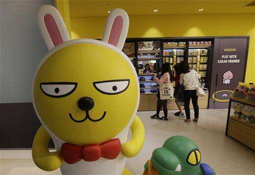In the April 4, 2016, photo, a popular character of Kakao Talk is displayed at Kakao Friends Shop in Seoul, South Korea. Kakao Talk and Line are two Asian mobile messengers that outgrew Facebook and Twitter in Japan and in South Korea in terms of user number. But as growth pace of users and revenues slowed, they have come under pressure to monetize new services. Kakato Talks has 48 million active users in about 230 nations, including 40 million in South Korea. (AP Photo/Ahn Young-joon) The Associated Press