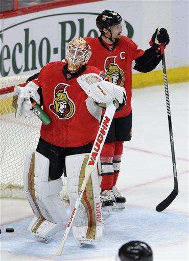 Ottawa Senators goalie Andrew Hammond, left, and defenseman Erik Karlsson react to a goal by Pittsburgh Penguins center Sidney Crosby, not pictured, during the second period of an NHL hockey game, Tuesday, April 5, 2016 in Ottawa, Ontario. (Sean Kilpatrick/The Canadian Press via AP) MANDATORY CREDIT The Associated Press