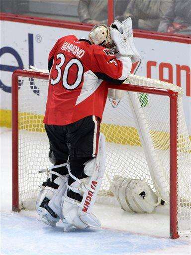 Ottawa Senators goalie Andrew Hammond (30) reacts after letting in the game winning goal against the Pittsburgh Penguins during the third period of an NHL hockey game, Tuesday, April 5, 2016 in Ottawa, Ontario. (Sean Kilpatrick/The Canadian Press via AP) MANDATORY CREDIT The Associated Press
