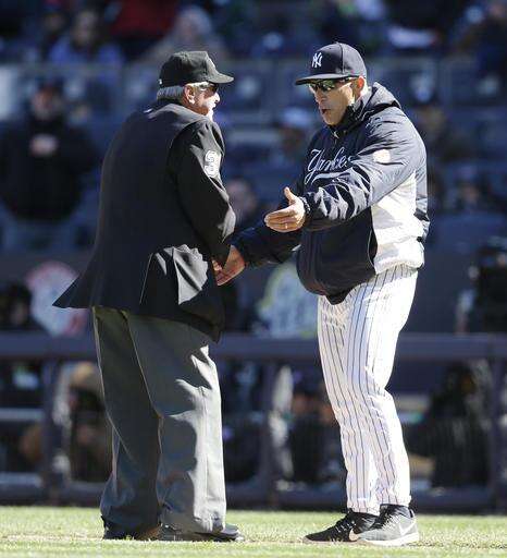 NEW YORK (AP) - Joe Girardi came running out of the dugout on a freezing afternoon for his first argument of the season.