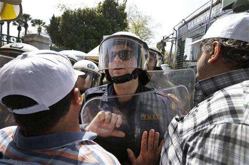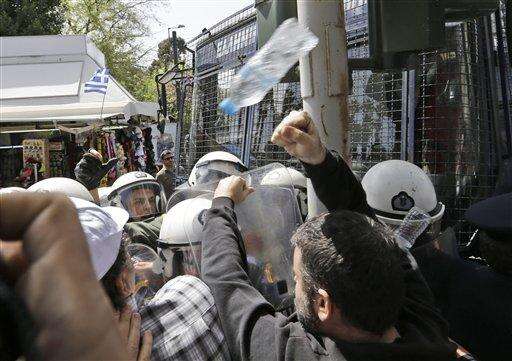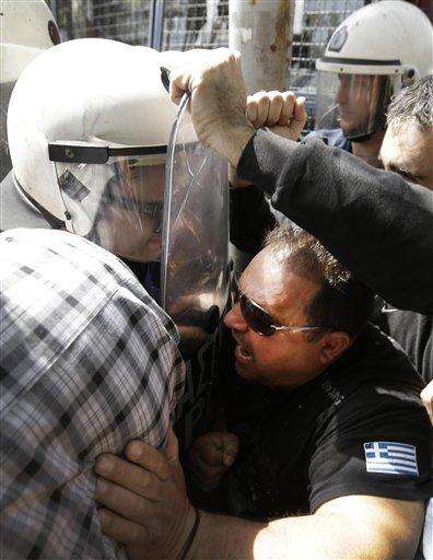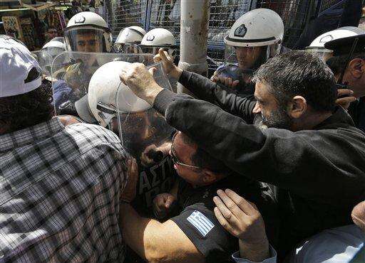 Greek dockworkers fight with Greek riot police officers, during a demonstration in central Athens, Friday, April 8, 2016. The workers were protesting against the deal between Greece and China's shipping giant COSCO for the Athens port of Piraeus, which was signed on Friday. (AP Photo/Lefteris Pitarakis)