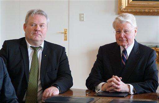 Iceland's President Olafur Ragnar Grimsson, right, is photographed by the media with Iceland's new Prime Minister Sigurdur Ingi Johannsson, at the president's residence Bessastadir, Reykjavik, Iceland, Thursday April 7, 2016. Iceland’s fisheries minister said Thursday the island nation’s president has approved a proposal that makes him Iceland’s new prime minister, a development that comes several days after his predecessor resigned after being linked to an offshore account. (AP Photo/David Keyton) The Associated Press