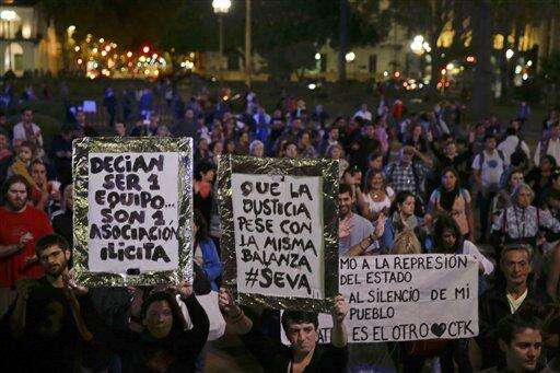 Demonstrators protest against President Mauricio Macri outside the government in Buenos Aires, Argentina, Thursday, April 7, 2016. An Argentine prosecutor on Thursday asked for an investigation into President Macri's role in offshore companies, adding to the global fallout from a massive leak of documents from a Panama law firm. The signs held by the protesters read in Spanish from left, "They said they were a team... It turned out they were an illicit association." "Let justice weigh them with the same scales." (AP Photo/Natacha Pisarenko) The Associated Press