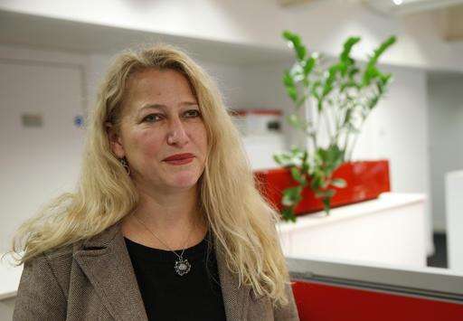 Tanya Freedman a volunteer of the charity Help Refugees poses for a photograph for the Associated Press in London, Friday, April, 8, 2016. Freedman relayed a call from a colleague in New York, who in turn had received a text from a young boy in the container, to the British police which helped them release the 15 refugees that had been locked in a container and were running out of air . The young boy had been given the phone by the charity Help Refugees in Calais, France. (AP Photo/Alastair Grant) The Associated Press