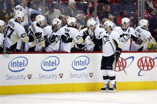 Pittsburgh Penguins center Matt Cullen (7) celebrates his goal with teammates in the first period of an NHL hockey game against the Washington Capitals, Thursday, April 7, 2016, in Washington. (AP Photo/Alex Brandon) The Associated Press