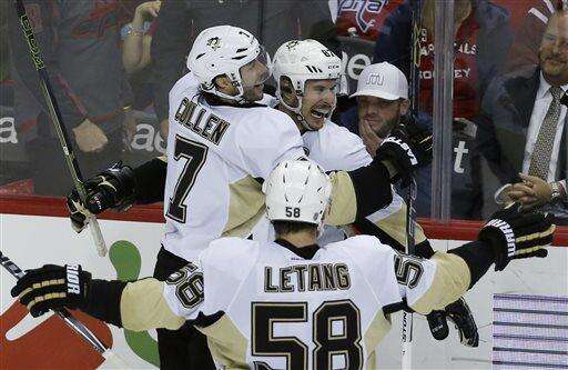 Pittsburgh Penguins centers Matt Cullen (7) and Sidney Crosby (87) celebrate Crosby's winning goal with defenseman Kris Letang (58) after the overtime period of an NHL hockey game against the Washington Capitals, Thursday, April 7, 2016, in Washington. (AP Photo/Alex Brandon) The Associated Press