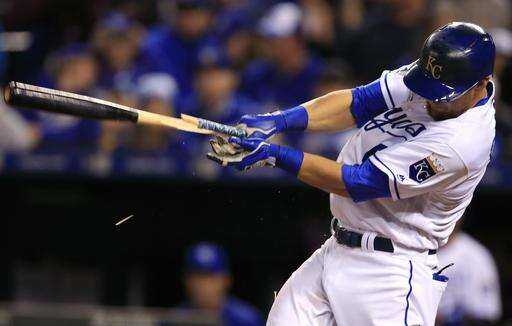 Kansas City Royals' Alex Gordon breaks his bat during the fourth inning of a baseball game against the Minnesota Twins at Kauffman Stadium in Kansas City, Mo., Friday, April 8, 2016. (AP Photo/Orlin Wagner) The Associated Press