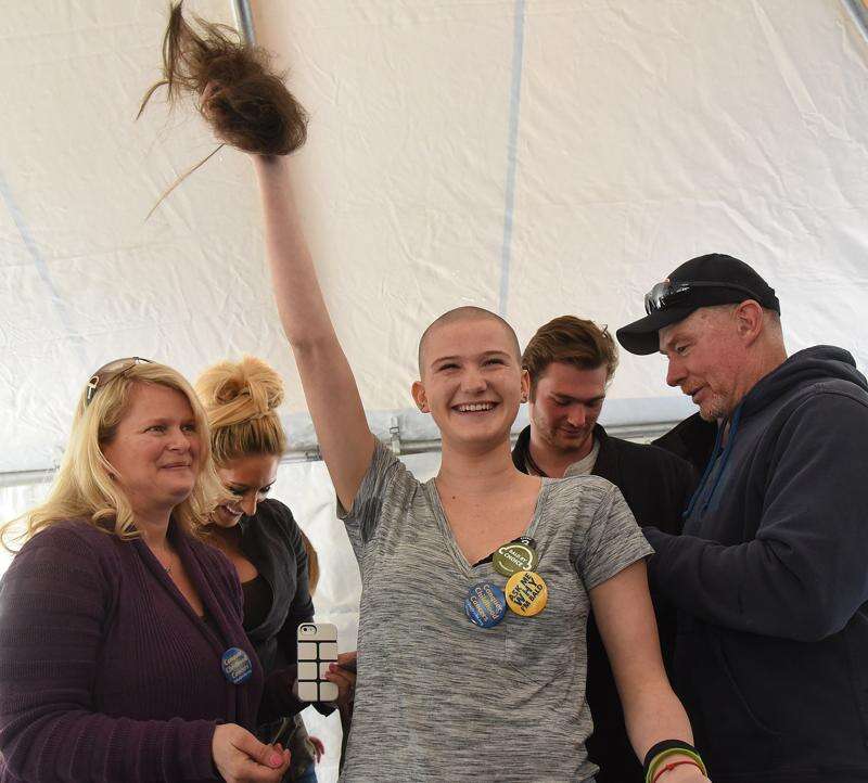 Lexie Zeppos of Arlington Heights holds up her shorn hair, accompanied by, from left, her mom Karen, hair stylist Karen Enzenbacher, her brother Nick and dad, Scott. Zeppos raised more than $30,000 in honor of a friend who died from cancer.