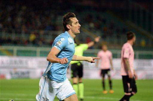 Miroslav Klose scored twice in a 3-0 win at relegation-threatened Palermo, with the match halted in each half after Palermo fans threw fireworks from the stands.