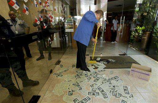 A janitor sweeps fake dollar bills placed by protesters at the entrance of the building used by the Mossack Fonseca law firm, as prosecutors raid their offices in Panama City, Wednesday, April 13, 2016. Organized crime prosecutors raided the offices of the Mossack Fonseca law firm on Tuesday, which continued into Wednesday, looking for evidence of money laundering and financing terrorism following a leak of documents about tax havens it set up for wealthy international clients. (AP Photo/Arnulfo Franco) The Associated Press