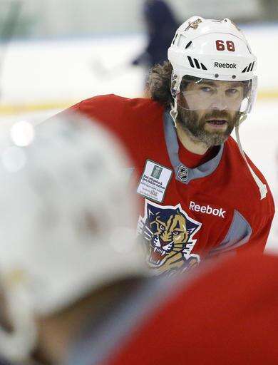 Florida Panthers right wing Jaromir Jagr prepares to pass the puck during a practice session, Tuesday, April 12, 2016, at the Panthers' practice facility in Coral Springs, Fla. The Panthers take on the New York Islanders in Game 1 of the first round of the playoffs on Thursday at Florida. (AP Photo/Wilfredo Lee) The Associated Press