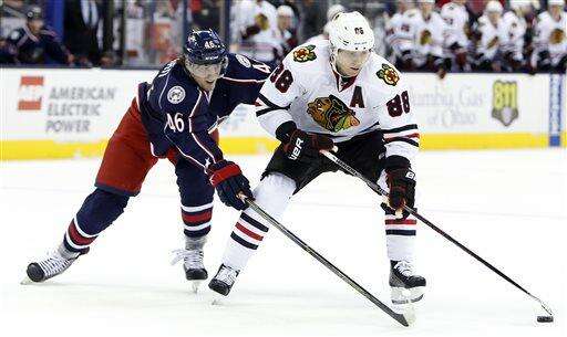 Chicago Blackhawks' Patrick Kane, right, keeps the puck away from Columbus Blue Jackets' Dean Kukan during the first period of an NHL hockey game Saturday, April 9, 2016, in Columbus, Ohio. (AP Photo/Jay LaPrete) The Associated Press