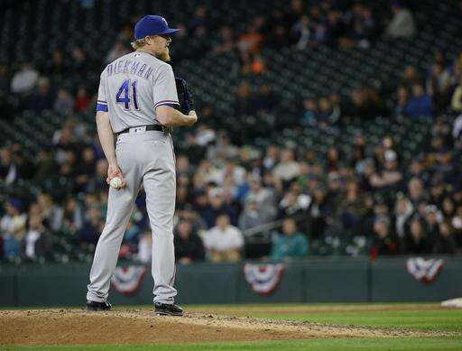 Texas Rangers pitcher Jake Diekman stands on the mound in the tenth inning of a baseball game against the Seattle Mariners, Wednesday, April 13, 2016, in Seattle. Later in the inning Diekman gave up a two-run walk-off home run to Seattle Mariners' Dae-Ho Lee, and the Mariners beat the Rangers 4-2 in tenth innings. (AP Photo/Ted S. Warren) The Associated Press