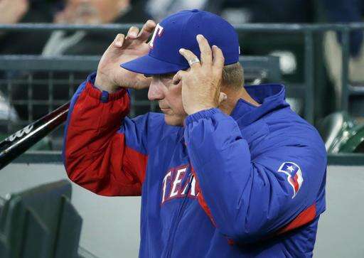 Texas Rangers manager Jeff Banister signals to umpires that he wants them to put on headphones and review a call that had Rangers' Adrian Beltre out at first in the sixth inning a baseball game against the Seattle Mariners, Wednesday, April 13, 2016, in Seattle. The challenge was successful and Beltre was ruled safe at first on a fielding error by Mariners first baseman Adam Lind. (AP Photo/Ted S. Warren) The Associated Press