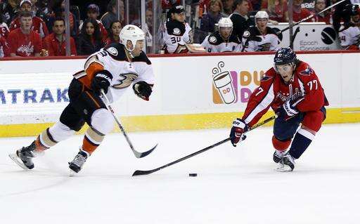 Anaheim Ducks defenseman Clayton Stoner (3) knocks the puck past Washington Capitals right wing T.J. Oshie (77) in the first period of an NHL hockey game, Sunday, April 10, 2016, in Washington. (AP Photo/Alex Brandon) The Associated Press