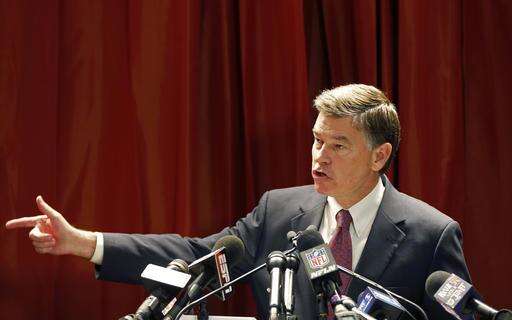 Peter Thomson, attorney for the family of former New Orleans Saints defensive end Will Smith, who was shot and killed after a traffic accident last Saturday, makes a hand gesture of a gun as he describes the shooter's actions, while speaking to reporters at University Medical Center in New Orleans, Wednesday, April 13, 2016. (AP Photo/Gerald Herbert)