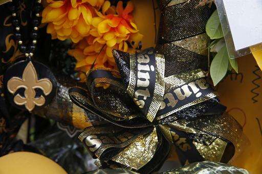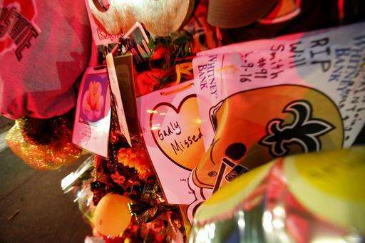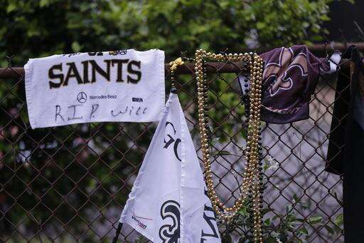 Mementos left by fans and well-wishers are displayed at a makeshift memorial in New Orleans, Tuesday, April 12, 2016, near the spot where former New Orleans Saints defensive end Will Smith was shot and killed, and his wife wounded by gunfire, after a traffic accident last Saturday. (AP Photo/Gerald Herbert)