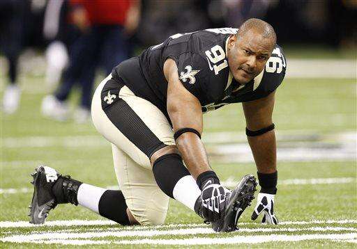 FILE - In this Dec. 9, 2012, file photo, New Orleans Saints defensive end Will Smith appears before an NFL football game against the New York Giants in East Rutherford, N.J. Smith was fatally shot after a traffic accident in New Orleans. (AP Photo/Bill Kostroun, File)