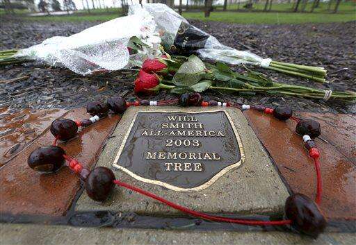 Flowers are placed by a plaque commemorating then Ohio State University football player Will Smith in his honor at the Buckeye Grove Garden near Ohio Stadium at Ohio State University in Columbus, Ohio, Monday, April 11, 2016. Former New Orleans Saints defensive end Smith was shot and killed, and his wife was wounded by gunfire after a traffic accident in New Orleans on Saturday. (Brooke LaValley/The Columbus Dispatch via AP) MANDATORY CREDIT
