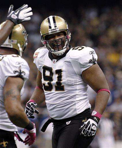FILE - In this Oct. 23, 2011, file photo, New Orleans Saints defensive end Will Smith (91) celebrates after pressuring Indianapolis Colts quarterback Curtis Painter during an NFL football game in New Orleans. Former New Orleans Saints player Will Smith was shot in the back and side, according to a warrant read in court Sunday night in New Orleans before a magistrate set a $1 million bond for the man accused of killing him. Police said Smith, 34, was killed in a case of road rage by a man who had rear-ended his car. (AP Photo/Jonathan Bachman, File)