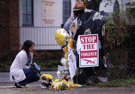 Gabriella Ortiz, of New Orleans, pauses at a makeshift memorial in New Orleans, Tuesday, April 12, 2016, near the spot where former New Orleans Saints defensive end Will Smith was shot and killed, and his wife wounded by gunfire, after a traffic accident last Saturday. (AP Photo/Gerald Herbert)