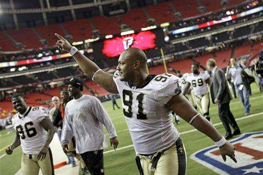 FILE - In this Dec. 27, 2010, file photo, New Orleans Saints defensive end Will Smith (91) celebrates a 17-14 win over the Atlanta Falcons in an NFL football game in Atlanta. Smith was fatally shot after a traffic accident in New Orleans. (AP Photo/David Goldman, File)