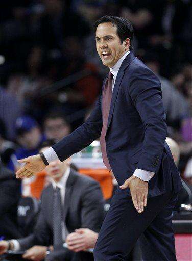 Miami Heat coach Erik Spoelstra shouts to his team during the first half of an NBA basketball game against the Detroit Pistons on Tuesday, April 12, 2016, in Auburn Hills, Mich. The Heat defeated the Pistons 99-93. (AP Photo/Duane Burleson) The Associated Press