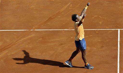 Spain's Rafael Nadal celebrates after defeating Austria's Dominic Thiem in their match of the Monte Carlo Tennis Masters tournament in Monaco, Thursday, April 14, 2016. (AP Photo/Lionel Cironneau) The Associated Press