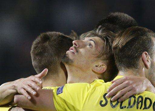 Villarreal’s Samuel Castillejo, center, celebrates his goal with teammate Villarreal’s Roberto Soldado during the Europa League quarter final second leg soccer match between Sparta Praha and Villarreal in Prague, Czech Republic, Thursday, April 14, 2016. (AP Photo/Petr David Josek) The Associated Press