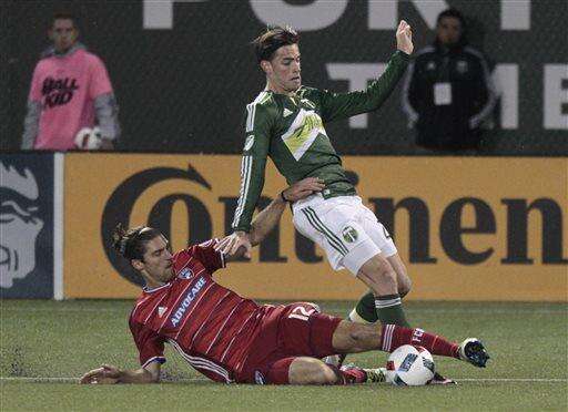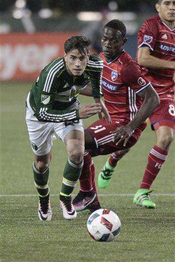 FC Dallas midfielder Ryan Hollingshead, left, and Portland Timbers forward Lucas Melano vie for the ball during the second half of an MLS soccer match in Portland, Ore., Wednesday, April 13, 2016. FC Dallas won 3-1. (AP Photo/Steve Dipaola)