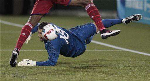 FC Dallas goalkeeper Chris Seitz makes a save against the Portland Timbers during the second half of an MLS soccer match in Portland, Ore., Wednesday, April 13, 2016. FC Dallas won 3-1. (AP Photo/Steve Dipaola)