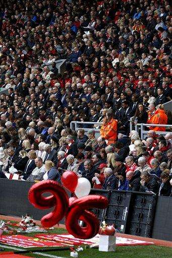 Members of the crowd including former Liverpool players and managers attend the last memorial service to be held at Anfield, Liverpool, England to mark 27 years to the day since the tragedy claimed 96 lives in the Hillsborough disaster Friday April 15, 2016. The 96 Liverpool fans died in the crush on the Leppings Lane terraces at Sheffield Wednesday's Hillsborough stadium after going to see their team play Nottingham Forest in an FA Cup semi-final on April 15, 1989 . (Peter Byrne/PA via AP) UNITED KINGDOM OUT The Associated Press