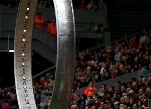 The Band of Life sculpture is displayed during the last memorial service to be held at Anfield, stadium Liverpool England, to mark 27 years to the day since the tragedy claimed 96 lives Friday April 15, 2016. The 96 Liverpool fans died in the crush on the Leppings Lane terraces at Sheffield Wednesday's Hillsborough stadium after going to see their team play Nottingham Forest in an FA Cup semi-final on April 15, 1989. (Peter Byrne/PA via AP) UNITED KINGDOM OUT The Associated Press