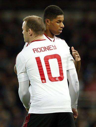 United’s Marcus Rashford, rear, is replaced by United’s Wayne Rooney during the English FA Cup quarterfinal replay soccer match between West Ham and Manchester United at Boleyn Ground stadium in London, Wednesday, April 13, 2016.(AP Photo/Alastair Grant) The Associated Press