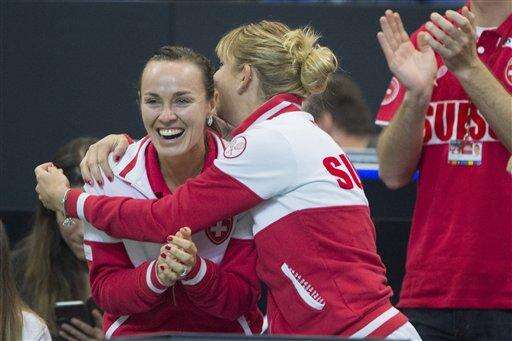 Switzerland's Martina Hingis, left, and Timea Bacsinszky, right, celebrate during the game of Switzerland's Viktorija Golubic against Karolina Pliskova of the Czech Republic, at the Fed Cup World Group semifinal tennis match between Switzerland and the Czech Republic, in Lucerne, Switzerland, Saturday, April 16, 2016. After the first two single matches the result is a 1-1 draw. . (Urs Flueeler/Keystone via AP) The Associated Press