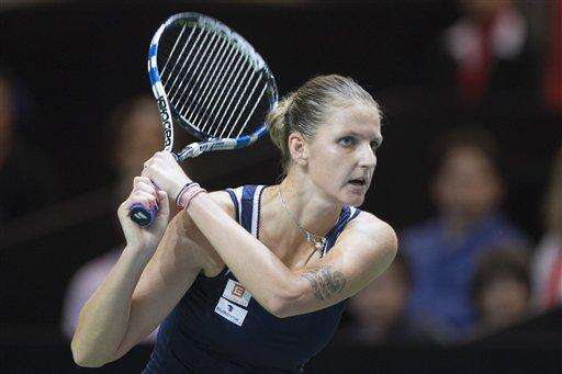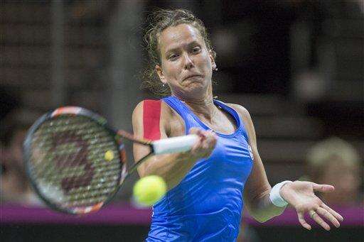 Karolina Pliskova of the Czech Republic returns a shot to Switzerland's Viktorija Golubic, during their Fed Cup World Group semifinal tennis match between Switzerland and the Czech Republic, in Lucerne, Switzerland, Saturday, April 16, 2016. (Urs Flueeler/Keystone viai AP)) The Associated Press