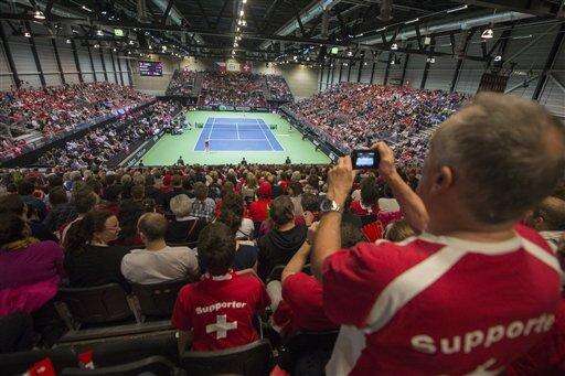 Spectactors watch Switzerland's Viktorija Golubic competing against Karolina Pliskova of the Czech Republic, during their Fed Cup World Group semifinal tennis match between Switzerland and the Czech Republic, in Lucerne, Switzerland, Saturday, April 16, 2016. (Urs Flueeler/Keystone via AP) The Associated Press