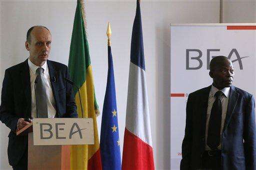 Remi Jouty, the head of France's Bureau of Investigation and Analysis for the Security of Civil Aviation (BEA) left, flanked with Mali's counterpart N'Faly Cisse delivers his speech on 2014 Air Algerie crash over Mali, blaming a mixture of mistakes for the disaster which killed 116 people, during a press conference in Le Bourget, north of Paris, France, Friday, April 22, 2016. Jouty says that the McDonnell Douglas MD-83 went down on July 24, 2014 near the rural town of Gossi after problems with its sensors probably caused by obstruction by ice crystals. (AP Photo/Francois Mori)