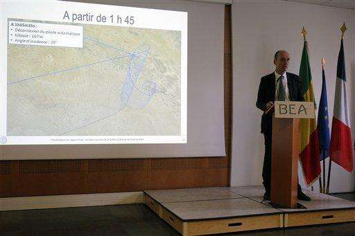 Remi Jouty, the head of France's Bureau of Investigation and Analysis for the Security of Civil Aviation (BEA) delivers his speech on 2014 Air Algerie crash over Mali, blaming a mixture of mistakes for the disaster which killed 116 people, during a press conference in Le Bourget, north of Paris, France, Friday, April 22, 2016. Jouty says that the McDonnell Douglas MD-83 went down on July 24, 2014 near the rural town of Gossi after problems with its sensors probably caused by obstruction by ice crystals. (AP Photo/Francois Mori)