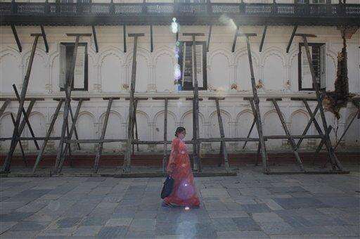 A Nepalese woman walks near a palace building damaged in last year's earthquake which now is supported by wooden logs at the Basantapur Durbar Square in Kathmandu, Nepal, Sunday, April 24, 2016. Government officials, diplomats and ordinary people gathered at the remains of a fallen iconic tower in the Nepalese capital on Sunday to mark the anniversary of a devastating earthquake that killed thousands and injured many more in the Himalayan nation. (AP Photo/Niranjan Shrestha)